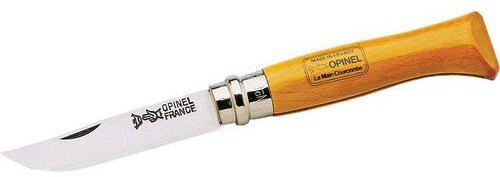 Biztonsági kés ütközővel, amely a pengét nyitott helyzetben tartja. Fa nyél felületkezeléssel. A penge szénacélból kovácsolt.